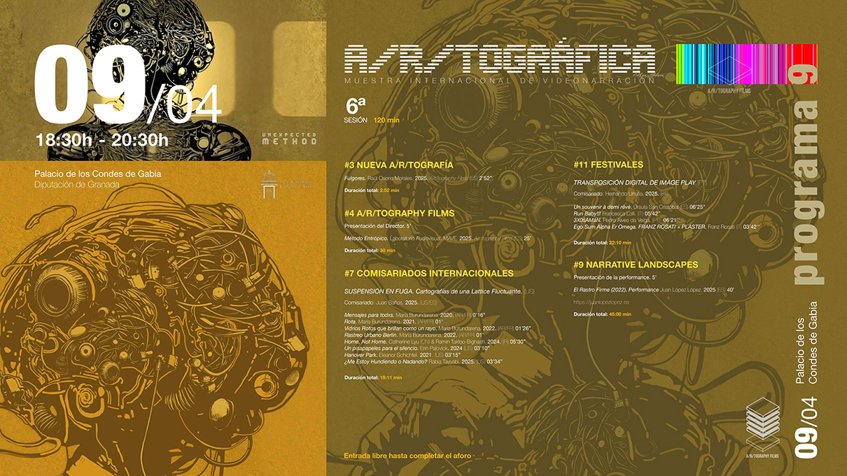 Hernando Urrutia has been invited to curate the 11th edition of the A/R/Tográfica International Video Narrative Exhibition 2024 (Granada, Spain) 9 April 2025, from 6:30 p.m. to 8:30 p.m., by the General Director of the International Exhibition of A/r/tographic Video Narration, Prof. Dr. Angel Garcia Roldán