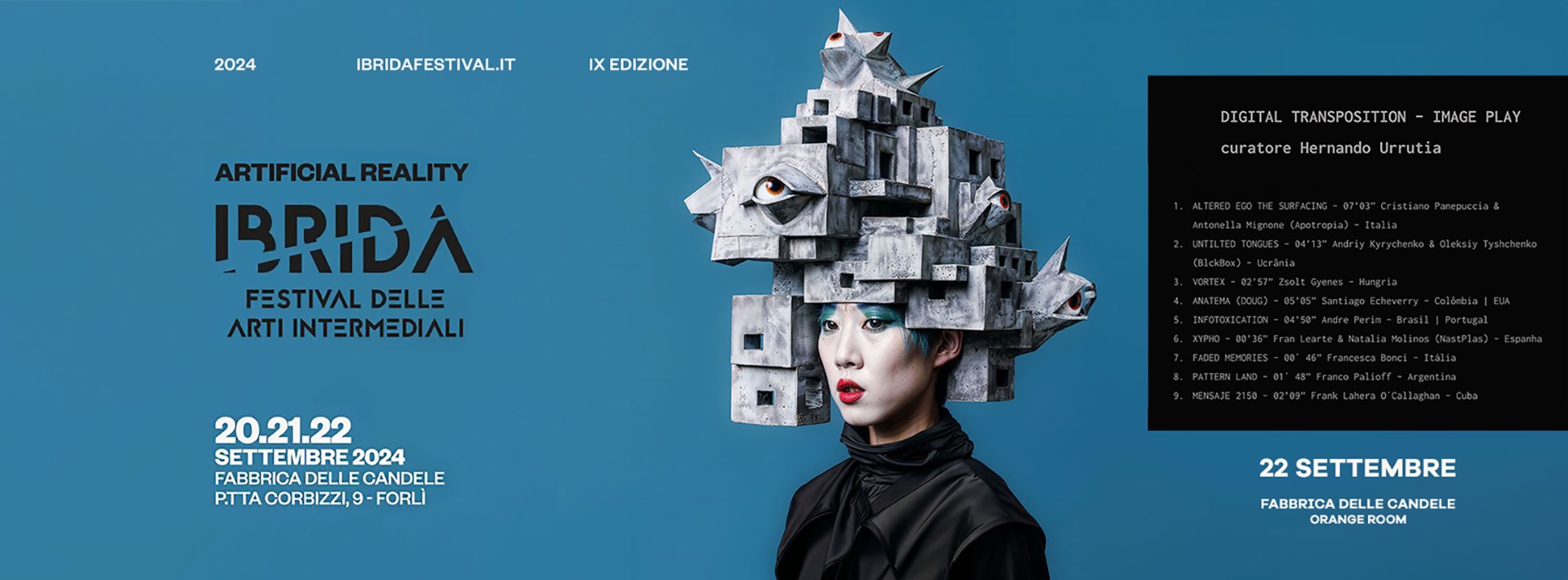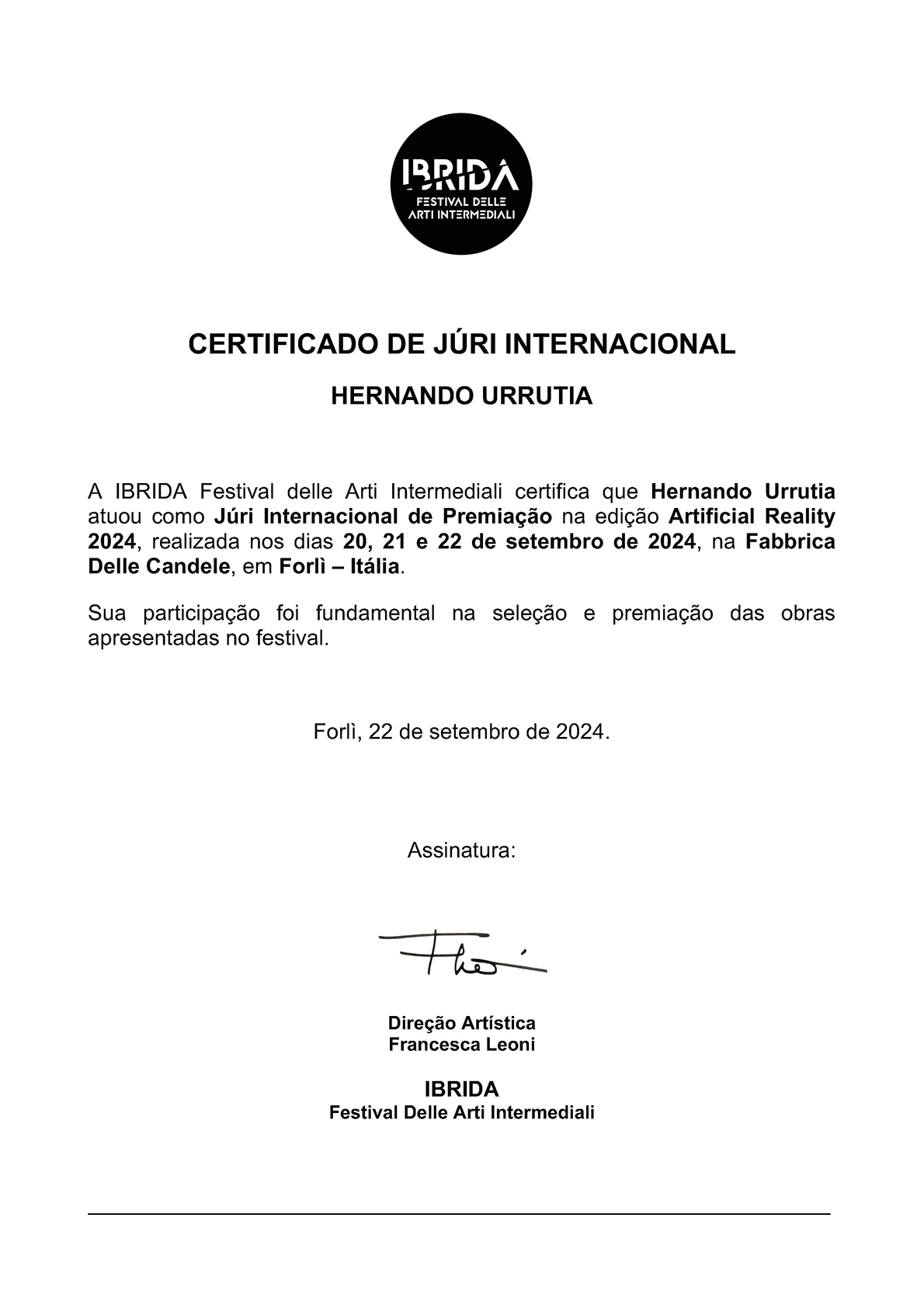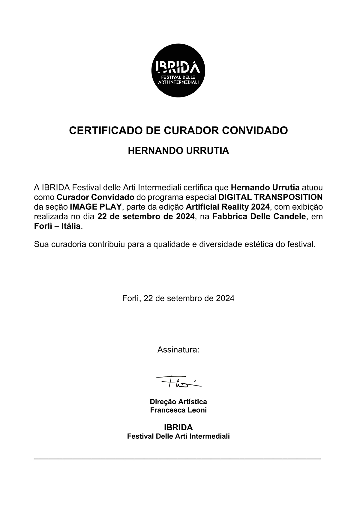 Due to the internationalisation of the excellent work carried out by IMAGE PLAY Curatorship and within the scope of international cultural exchange, the Director and Curator of IMAGE PLAY ►International Video Art Festival, Dr Hernando Urrutia, was invited by Artistic Directors Francesca Leoni and Davide Mastragelo from the VERTOV PROJECT organisation to be a member of the Award Jury Committee for the Open Call for the 9th Edition of the IBRIDA Festival delle Arti Intermediali | Artificial Reality, 20, 21 and 22 September 2024, in Forli, Italy.