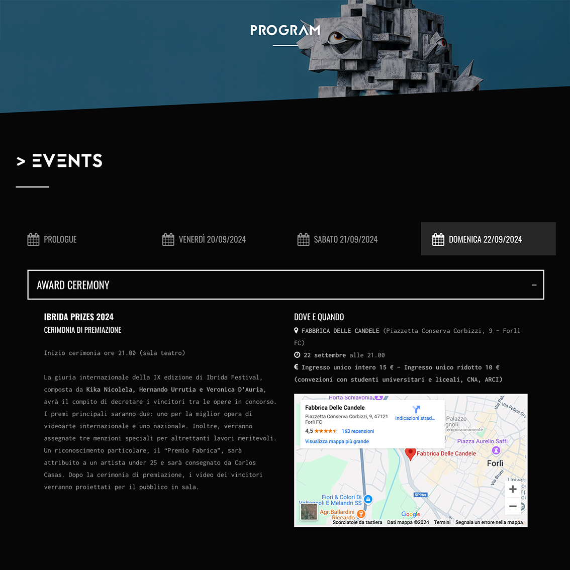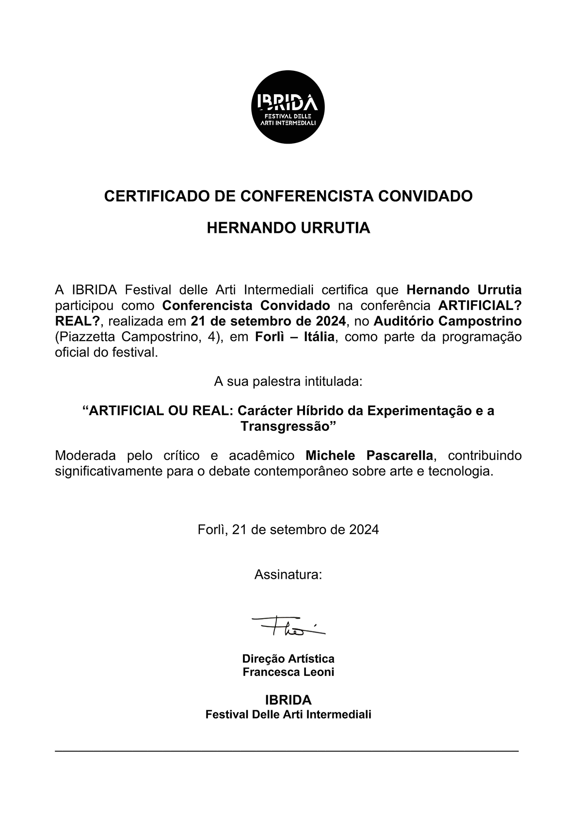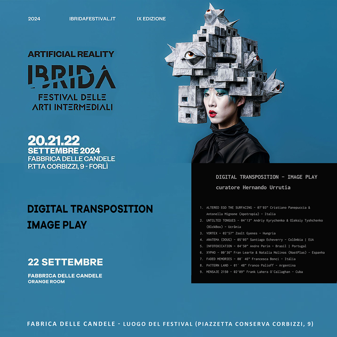 Due to the internationalisation of the excellent work carried out by IMAGE PLAY Curatorship and within the scope of international cultural exchange, the Director and Curator of IMAGE PLAY ►International Video Art Festival, Dr Hernando Urrutia, was invited by Artistic Directors Francesca Leoni and Davide Mastragelo from the VERTOV PROJECT organisation to be a member of the Award Jury Committee for the Open Call for the 9th Edition of the IBRIDA Festival delle Arti Intermediali | Artificial Reality, 20, 21 and 22 September 2024, in Forli, Italy.