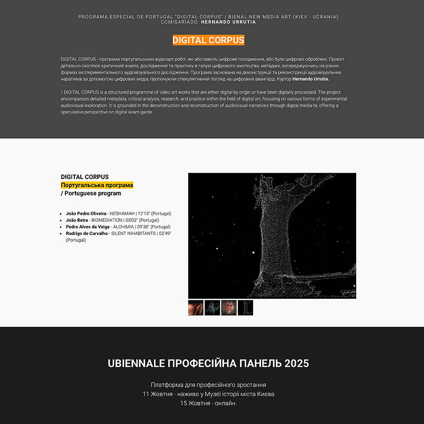 Agradeço à BIENAL NEW MEDIA ART, especialmente aos diretores e curadores Valery Korshunov (Curador do Programa Ucraniano) e Iury Lech (Curador do Programa Internacional), pelo gentil convite para realizar a curadoria do Programa Especial de Portugal DIGITAL CORPUS da IMAGE PLAY, muito obrigado.
