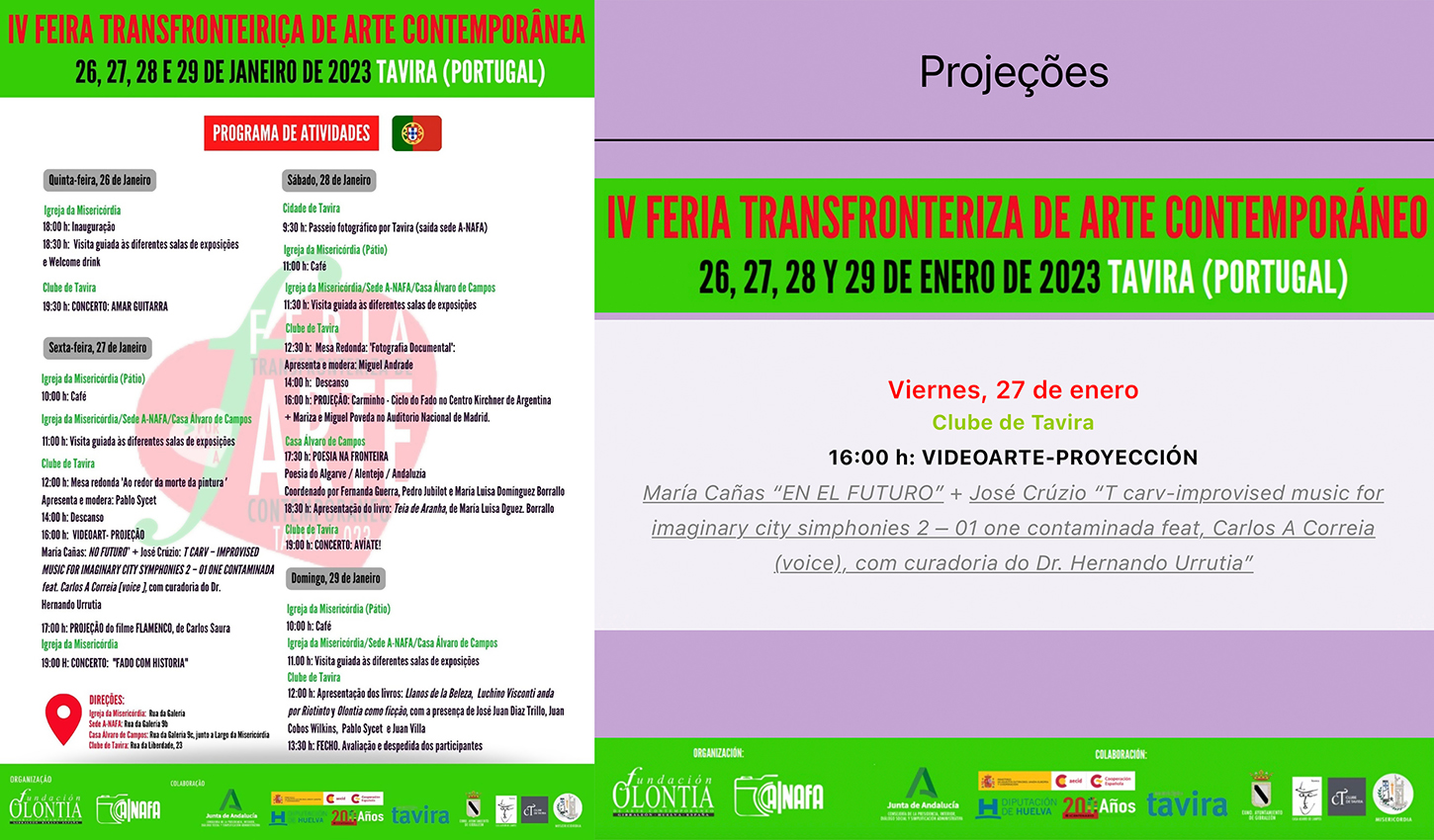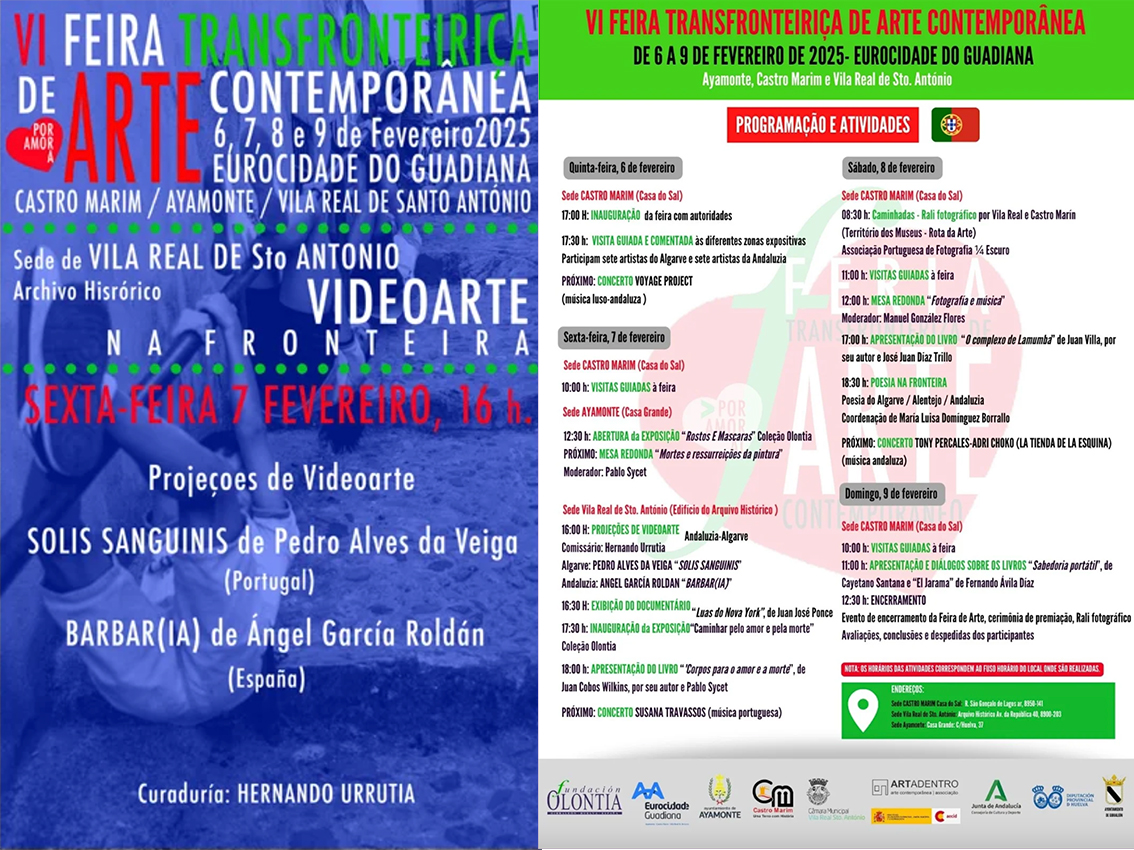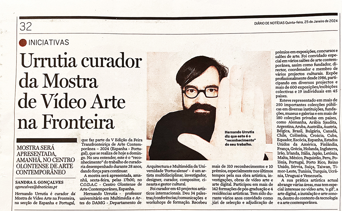Hernando Urrutia is invited as curator of the Video Art Exhibition at the Border, at the Cross-Border Contemporary Art Fair (Spain - Portugal) on 7 February 2025, at 4 pm, by the president of the Olintia Foundation, D. Pablo Sycet Torres. Presenting a special selection from both countries, representing Portugal and Spain since IMAGE PLAY ► International Video Art Festival 6-7-8-9/2/2025.