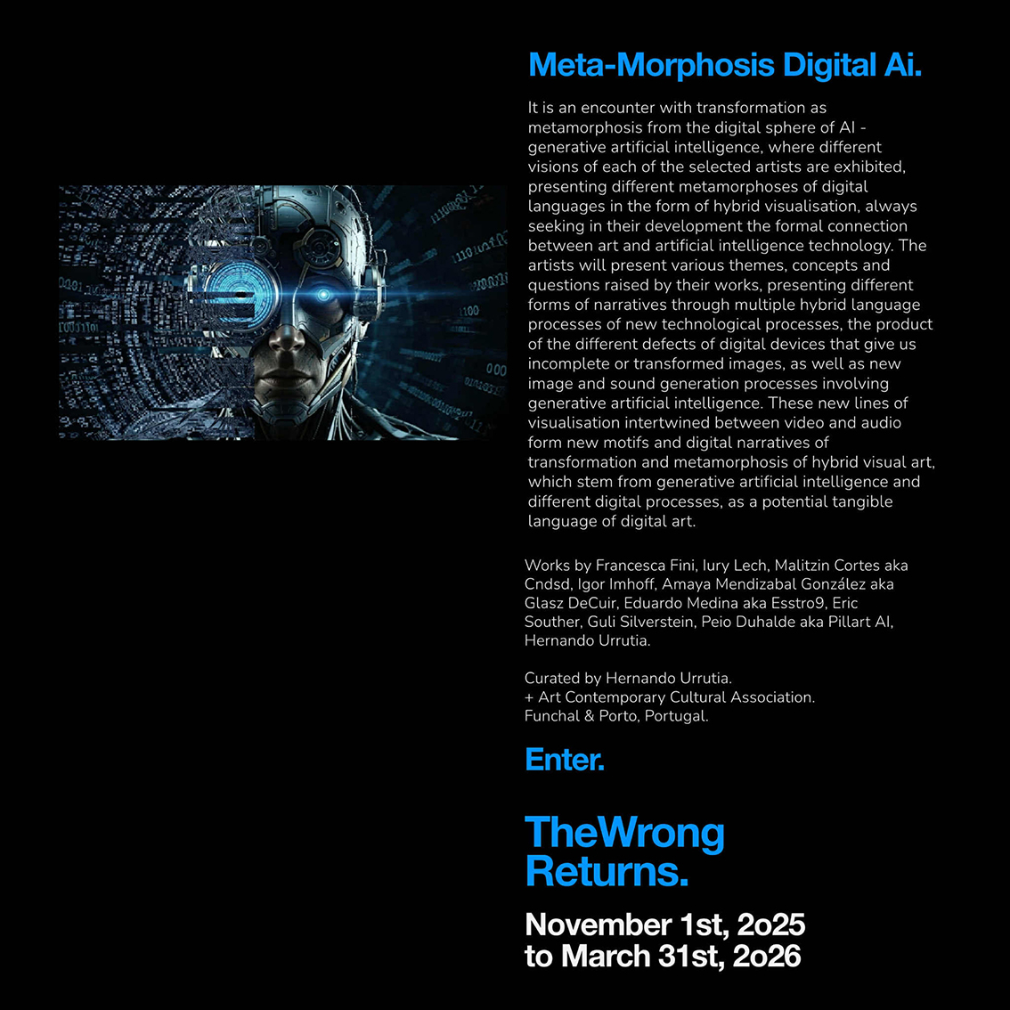 Apresentando o Curador Dr. Hernando Urrutia uma proposta de curadoria com o projeto selecionado: META-MORPHOSIS digital AI que é um pavilhão da "7th Edition of the Wrong Biennale" Espanha, que tem uma exibição de 10 artistas multidisciplinares de meios audiovisuais experimentais, que serão exibidos on-line a partir do seu próprio espaço on-line (Portugal) e dos canais "thewrong.tv" e "180.thewrong.tv" (Portugal), que têm 24 horas de emissão televisiva para mostrar conceitos e obras de arte como uma experiência de televisão linear. Sob a Curadoria de Hernando Urrutia e da Direção Geral de David Quiles Guilló.