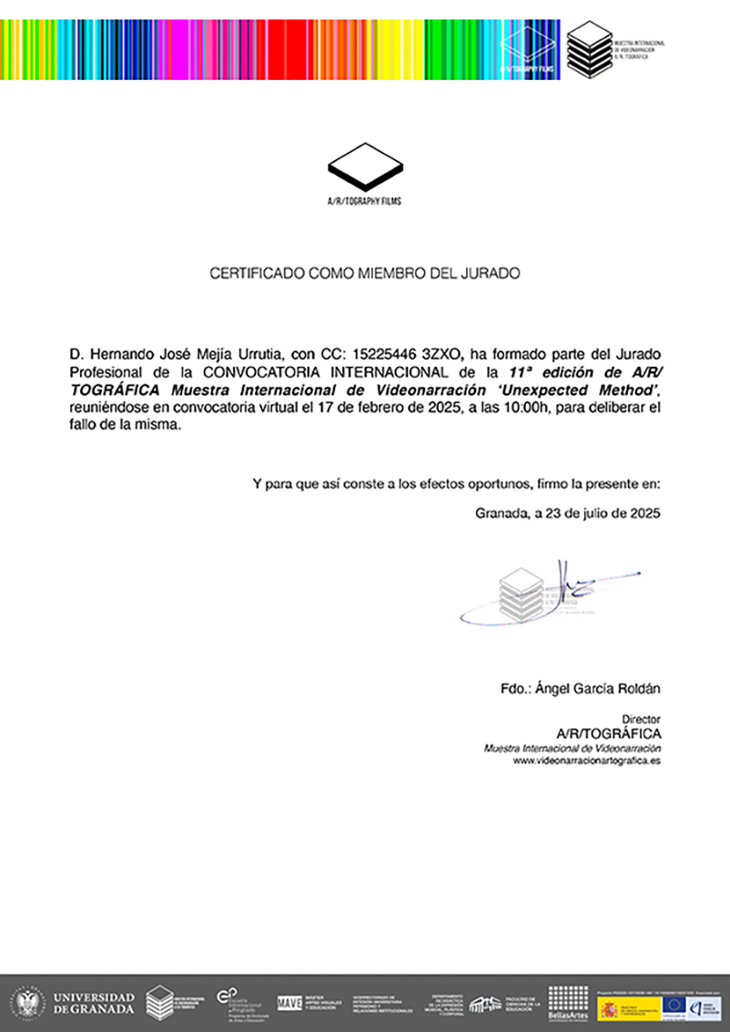 Hernando Urrutia has been invited to be a member of the selection jury for the 11th edition of "A/R/TOGRÁFICA - INTERNATIONAL VIDEO NARRATIVE EXHIBITION" IN SPAIN. (March 7 to June 20, 2025)