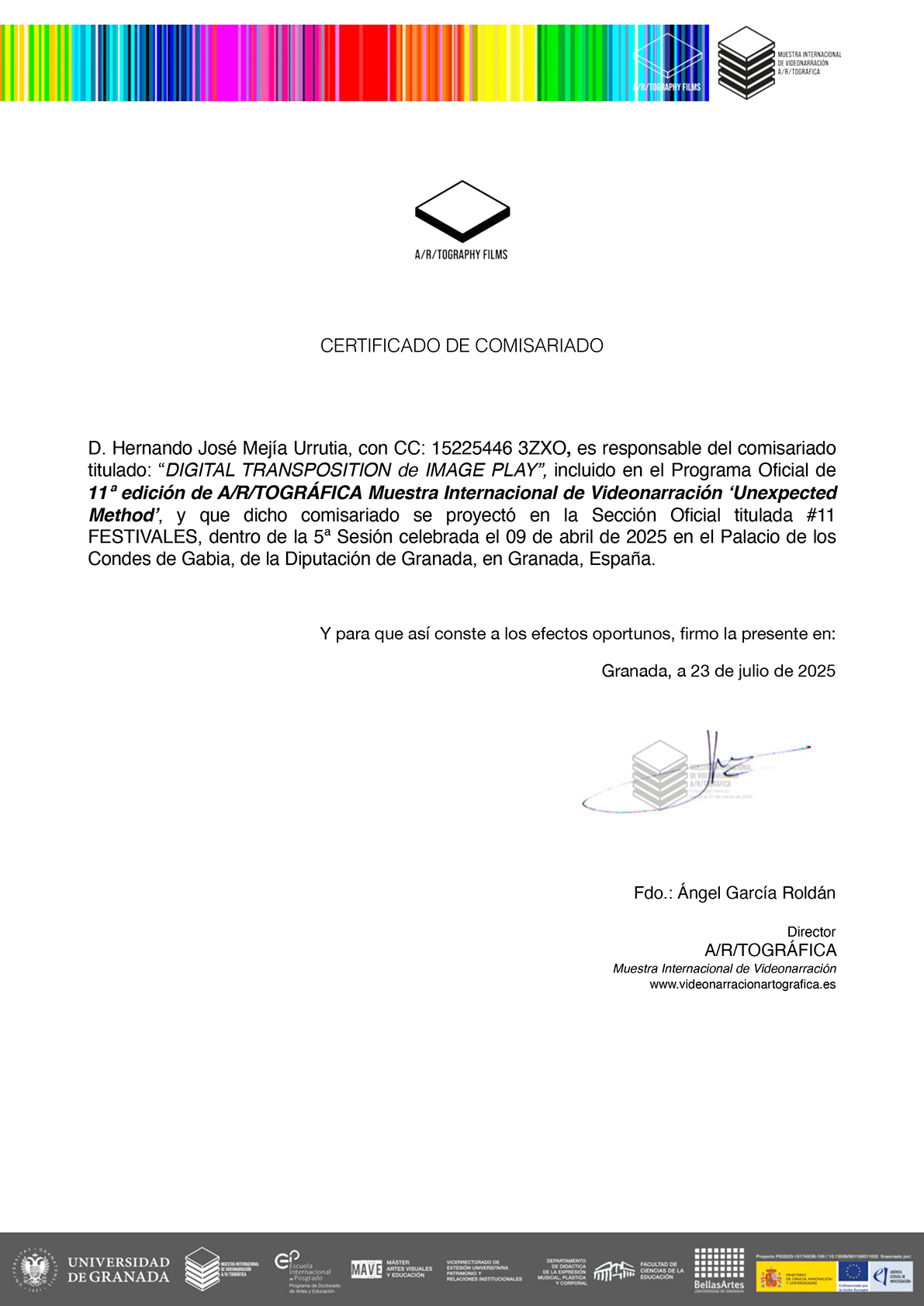 Programa Especial DIGITAL TRANSPOSITION de IMAGE PLAY ► para 10ª Edición de la Muestra Internacional de Videonarración A/R/Tográfica 2024 - Curador Internacional Convidado: Hernando Urrutia, apresentado na 2ª Seção, no Programa #9 de Curadorias Internacionais, no "Palacio de los Condes de Gabia" o dia 20 de março de 2024.
