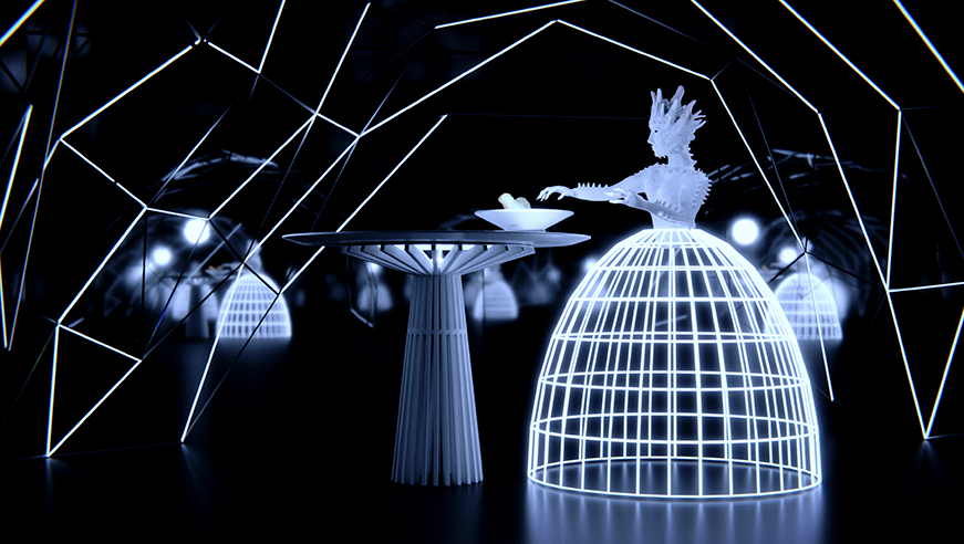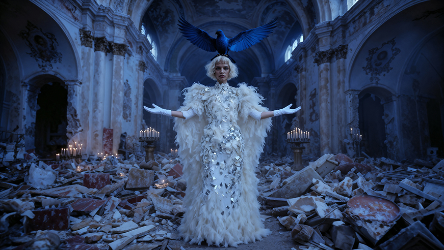 Somnium Corvi is therefore not only a film, but also a research practice: an exploration of how AI can generate new dramaturgies where architecture becomes protagonist, costumes transform into extensions of the psyche, and bodies carve out meaning through gestures suspended between the real and the surreal. It is a cinema of vision and performance, where narrative becomes an evolving score and the AI becomes a collaborator in the act of invention.