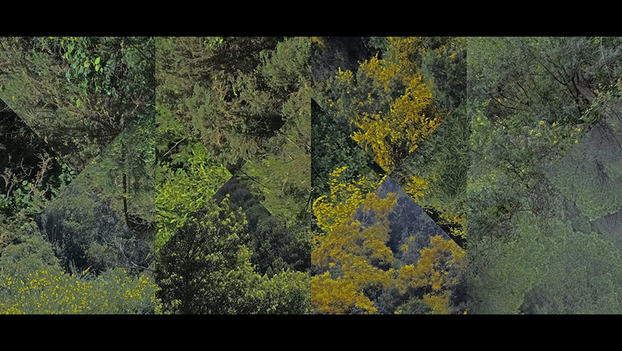 LEAFY WEFT is a four-channel video created from four photographs of leafy landscapes taken on the island of Madeira. In the video, the superimposition of the same photographic image in four opposing movements (two horizontal and two vertical) creates an abstract pattern that deceives us about the true nature of the image. When the four movements given to the image come together in their entirety, at some point halfway through the video, the photographic matrix is revealed for a few brief moments.