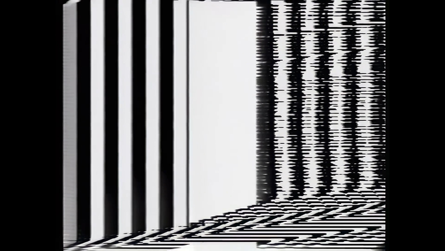 B&W lines made with an analogue sound synthesiser and video mixer.